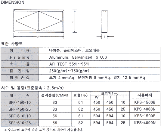 | 1. 중량법 85% 포집효율2. 전자, 정밀, 식품, 의약 제조공정의 전처리용으로 사용3. 빌딩 공조용 및 전처리용으로 사용 |
